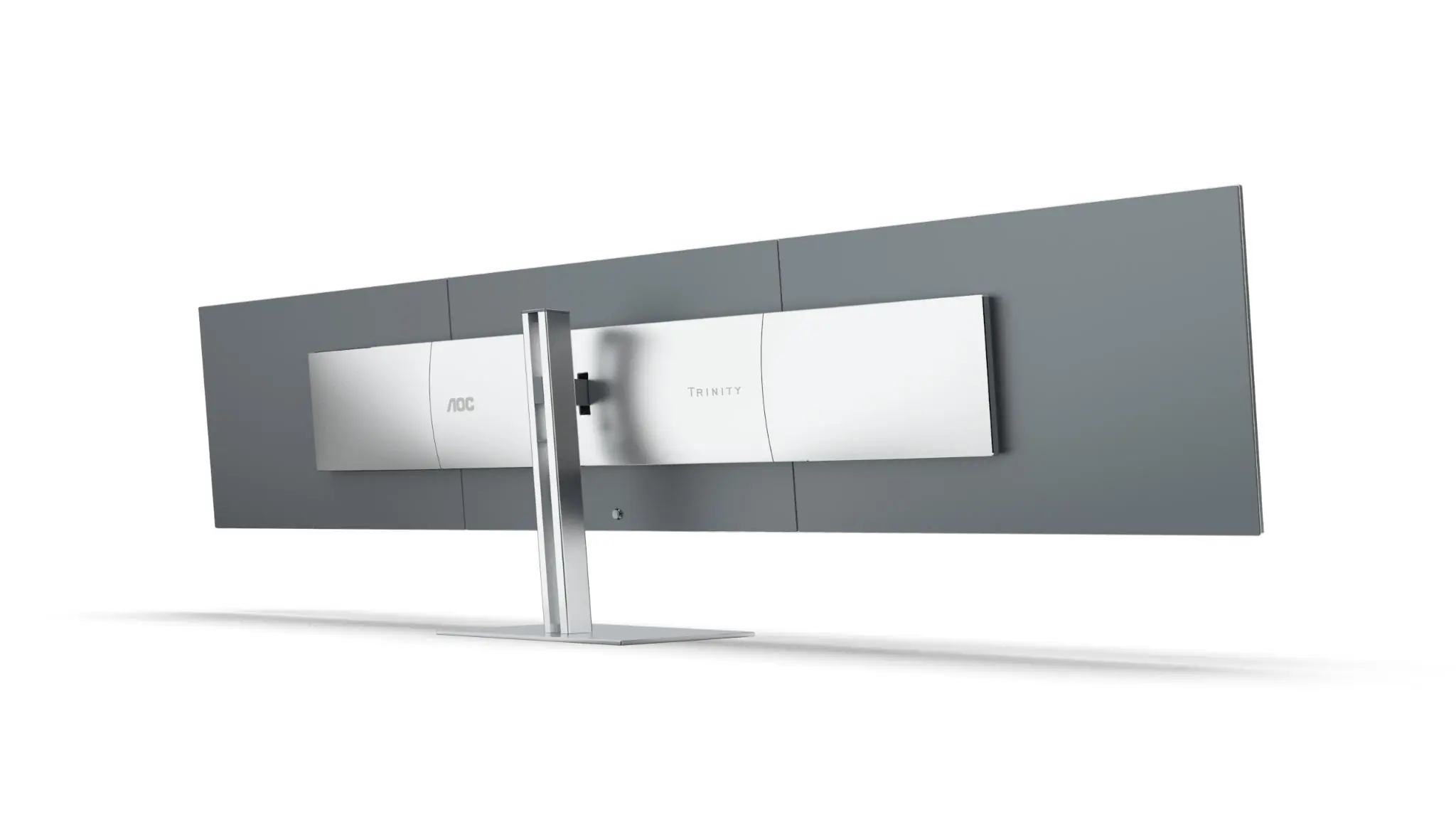 ในฐานะโซลูชันจอ 3 หน้าจอจากผู้ผลิตมอนิเตอร์โดยตรง AOC Trinity โดดเด่นด้านความเรียบหรูและเป็นระเบียบ เพราะใช้ขาตั้งเพียงตัวเดียวในการยึดจอทั้งสาม ลดการใช้พื้นที่บนโต๊ะทำงานได้อย่างมาก