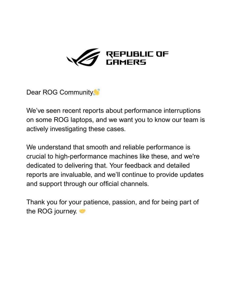 ล่าสุด ASUS ROG ได้ออกแถลงการณ์อย่างเป็นทางการผ่านบัญชี ASUS ROG North America X โดยมีเนื้อหาดังนี้: