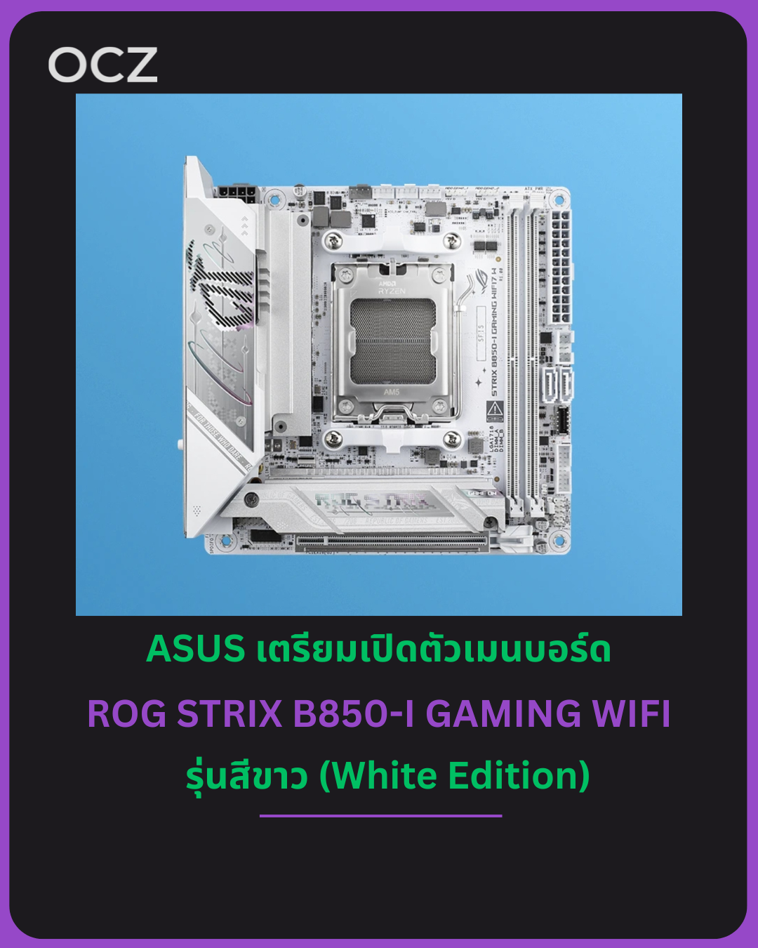 ASUS Republic of Gamers ออกมาแอบเผยทีเซอร์ของเมนบอร์ด STRIX B850-I GAMING WIFI รุ่นแตกไลน์ใหม่ ซึ่งใกล้เปิดตัวในเร็ว ๆ นี้ โดยรุ่นสีดำมาตรฐานวางขายมาเกือบหนึ่งปีแล้ว และกำลังจะมี “พี่น้องโทนขาว” เข้ามาเสริมทัพเมนบอร์ดไซซ์เล็ก (SFF) ของแบรนด์จากไต้หวัน