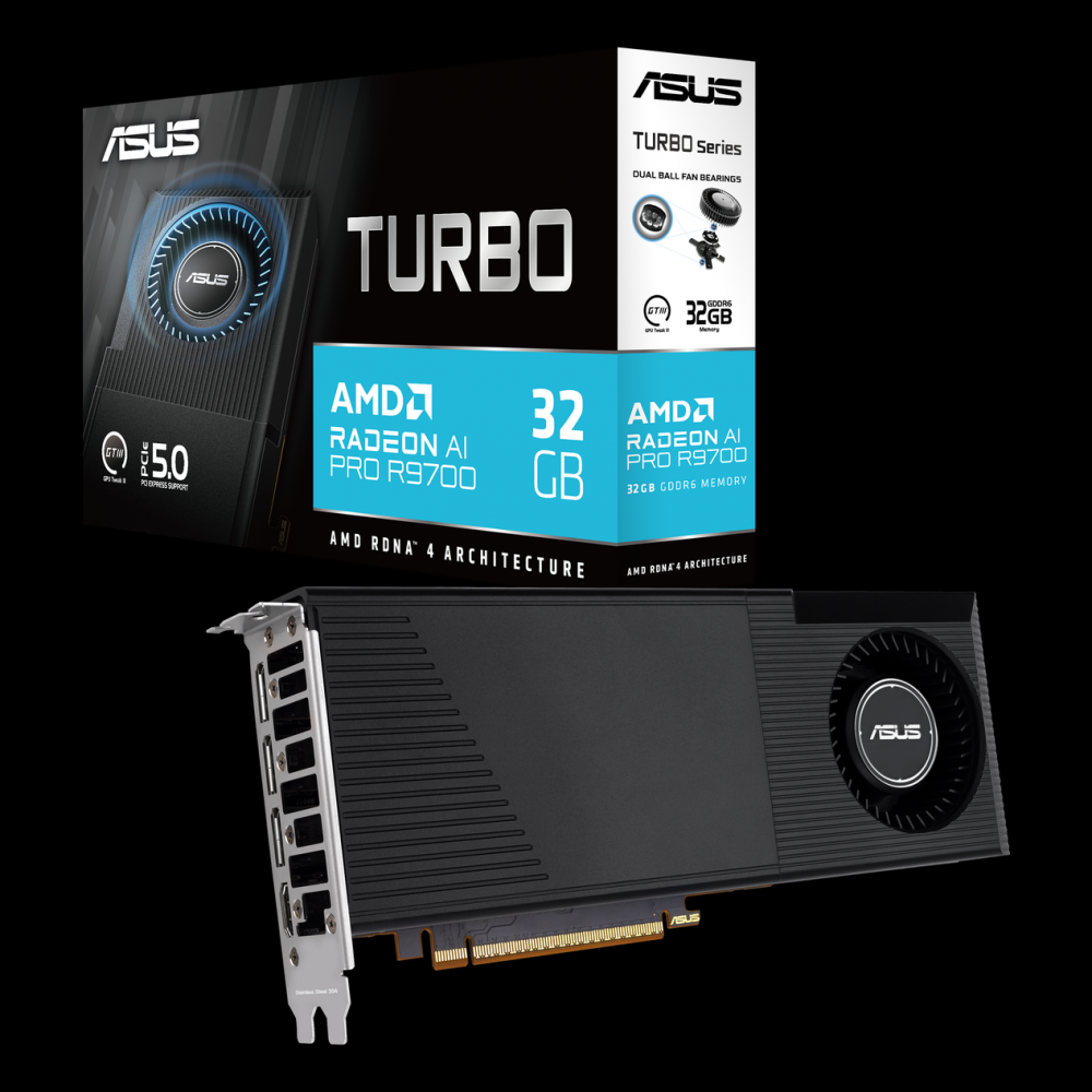 การ์ด Radeon AI PRO R9700 เปิดตัวครั้งแรกตั้งแต่เดือนกรกฎาคม แต่ AMD ไม่ได้ออก reference model ทำให้เป็นหน้าที่ของพาร์ทเนอร์อย่าง ASUS ที่นำเสนอผลิตภัณฑ์เอง โดยรุ่น Turbo มาพร้อม VRAM 32GB, AI Accelerators 128 ตัว และประสิทธิภาพสูงสุด 1531 TOPS (INT4) วางตำแหน่งสำหรับงาน AI Development ควบคู่ไปกับงาน Workstation มาตรฐาน