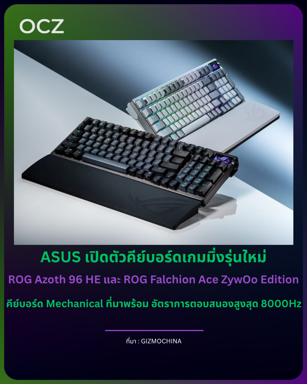 ASUS Republic of Gamers (ROG) เปิดตัวคีย์บอร์ดเกมมิ่งรุ่นใหม่ 2 รุ่น ได้แก่ ROG Azoth 96 HE และ ROG Falchion Ace HFX ZywOo Edition ซึ่งออกแบบมาเพื่อมอบประสบการณ์การเล่นเกมความเร็วสูง ด้วยการตอบสนองที่รวดเร็ว ความแม่นยำระดับโปร และสัมผัสการพิมพ์ที่หรูหราและละเอียดอ่อน