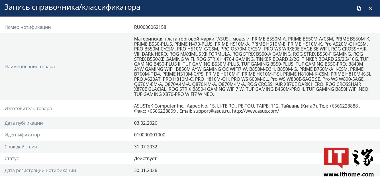 ASUS ได้จดทะเบียนผลิตภัณฑ์เมนบอร์ดหลายรุ่นกับระบบข้อมูลอ้างอิงแบบรวมของสหภาพเศรษฐกิจยูเรเชีย (Eurasian Economic Union Unified Reference Information System) โดยมีรุ่นที่น่าสนใจปรากฏอยู่ 2 รุ่น คือ TUF GAMING B850I WIFI NEO และ Pro WS W890M-SAGE