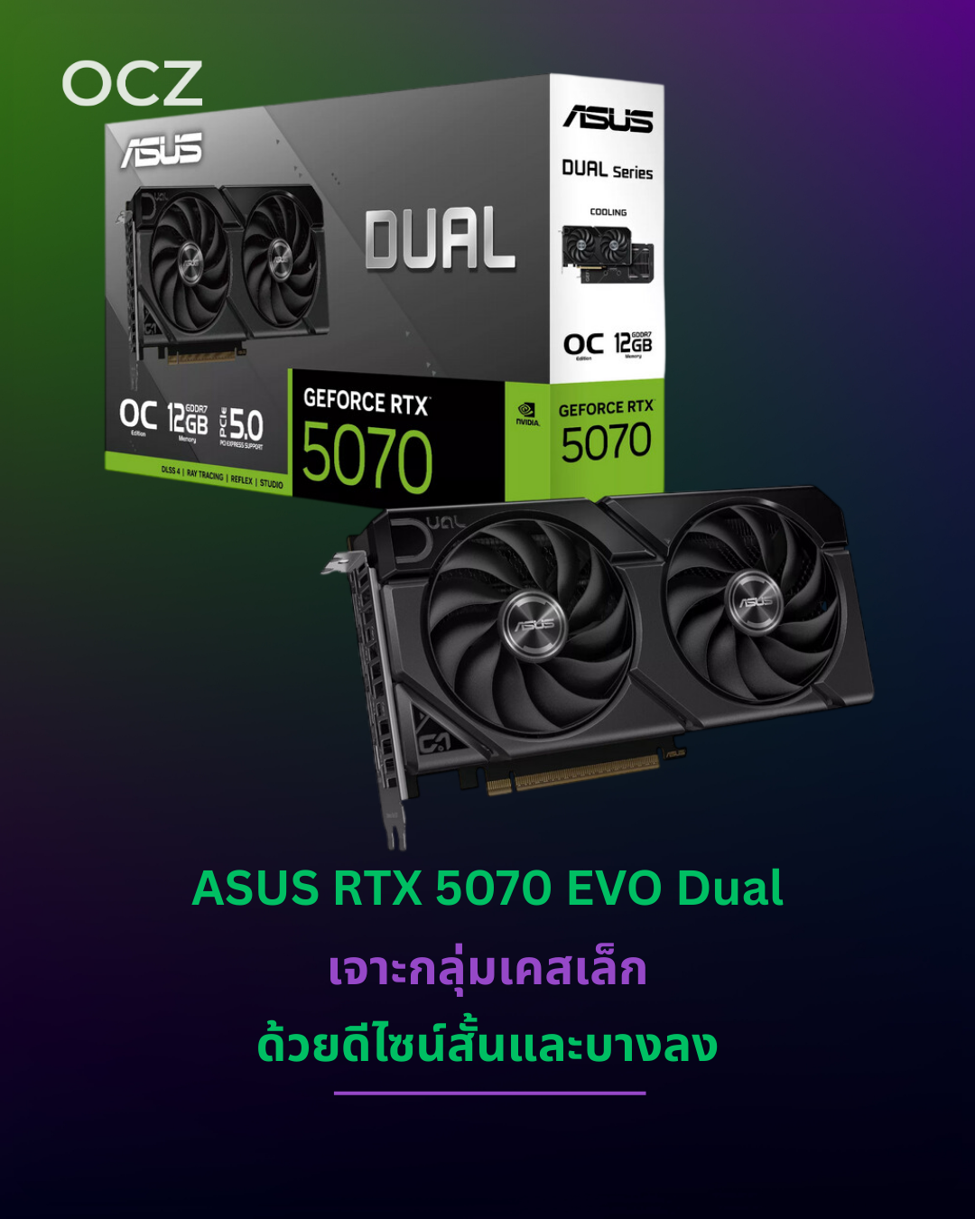ล่าสุด ASUS ได้ขยายไลน์ Dual Evo แบบเงียบ ๆ ด้วยการเพิ่ม ASUS Dual GeForce RTX 5070 Evo และ Evo OC โดยทั้งสองรุ่นใช้ GPU NVIDIA GeForce RTX 5070 ขนาด 12GB จาก NVIDIA บรรจุอยู่ในตัวการ์ดที่มีขนาดเพียง 229 × 120 × 50 มม.