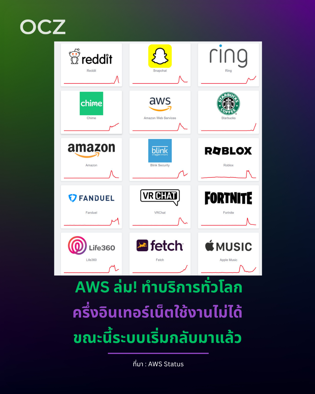 Amazon Web Services (AWS) ประสบปัญหาขัดข้องครั้งใหญ่ ส่งผลให้ “ครึ่งหนึ่งของอินเทอร์เน็ต” ที่พึ่งพาโครงสร้างพื้นฐานของ AWS ไม่สามารถให้บริการได้ชั่วคราว อย่างไรก็ตาม ขณะนี้หลายระบบเริ่มทยอยฟื้นตัวแล้ว