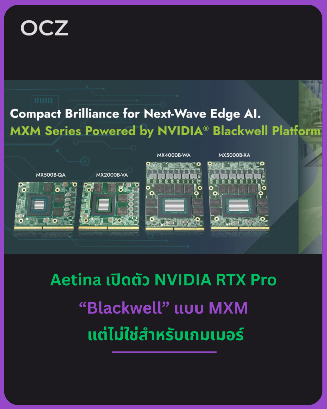 Aetina เปิดตัวโมดูล CoreEdge MXM AI Accelerator รุ่นใหม่ ที่ใช้ NVIDIA RTX PRO Blackwell Embedded GPUs โดยรุ่นแรกที่เปิดตัวคือ MX500B-QA และ MX5000B-XA ทั้งคู่ใช้มาตรฐาน MXM 3.1 สำหรับระบบเอดจ์ที่ต้องการขนาดกะทัดรัด ถือเป็นเรื่องดีที่ได้เห็นฟอร์มแฟกเตอร์ MXM กลับมาใช้อีกครั้งกับ GPU เจเนอเรชันล่าสุด แม้จะไม่ใช่การ์ดเล่นเกม แต่เป็นรุ่นสำหรับงานมืออาชีพโดยเฉพาะ
