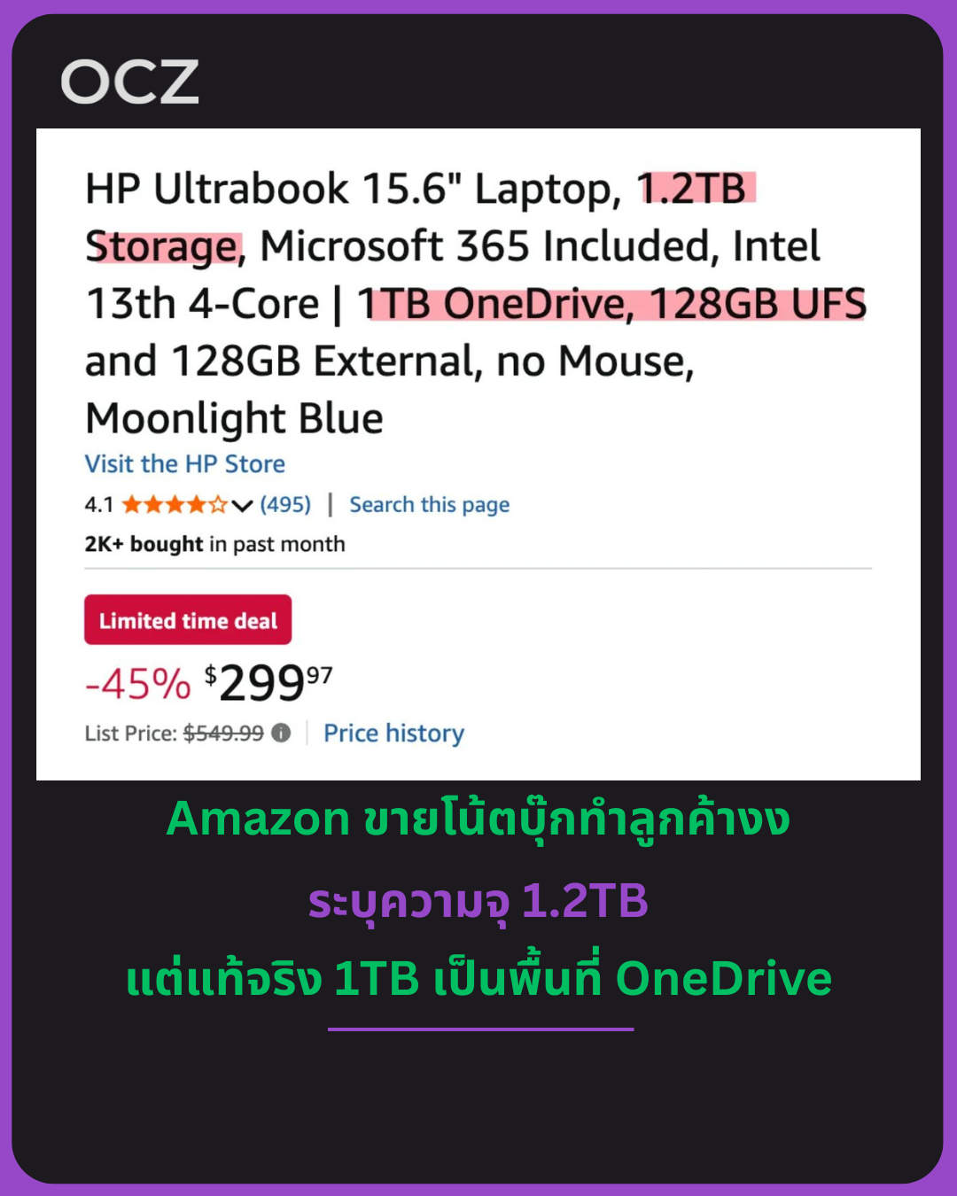 ช่วงหลังมานี้บน Amazon มีหน้าสินค้าโน้ตบุ๊กจำนวนมากที่ให้ข้อมูลสเปก ความจุเก็บข้อมูลแบบชวนให้เข้าใจผิด โดยระบุว่ามีความจุ 1.2TB แต่ในความเป็นจริง 1TB เป็นพื้นที่คลาวด์ OneDrive ทำให้ผู้ใช้มือใหม่หรือผู้ที่ไม่คุ้นเคยกับเทคโนโลยีจำนวนมากหลงเชื่อ
