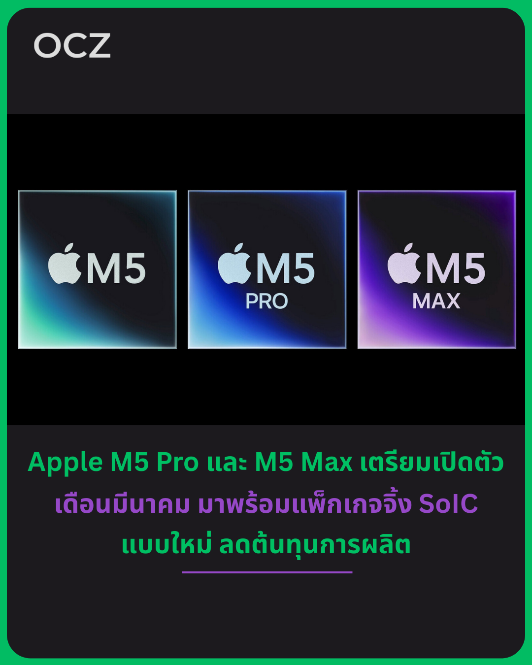 ก่อนหน้านี้มีข้อมูลหลุดออกมาว่า MacBook Pro ที่ใช้ชิป Apple M5 Pro และ M5 Max คาดว่าจะเปิดตัวในช่วงครึ่งแรกของปี 2026 แต่ข่าวลือล่าสุดจาก Fixed Focus Digital บน Weibo ระบุว่า ตัวชิป M5 Pro และ M5 Max เองอาจเปิดตัวเร็วถึงเดือนมีนาคม 2026
