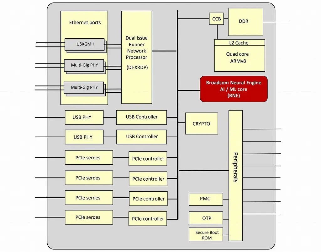 ฝั่ง Access Point Broadcom เปิดตัว Accelerated Processing Unit (APU) รุ่นใหม่ชื่อ BCM49438 ซึ่งถูกวางตำแหน่งให้เป็นการผสานระหว่างตรรกะด้านเครือข่ายและตัวเร่ง AI ทำให้ตัว AP มีพลังประมวลผลภายในเพียงพอสำหรับงานวิเคราะห์ข้อมูลและระบบอัตโนมัติแบบรันในเครื่องได้โดยตรง ในสภาพแวดล้อมองค์กรยุคใหม่ Access Point ไม่ได้มีหน้าที่แค่กระจายสัญญาณ Wi-Fi เท่านั้น แต่ยังต้องเก็บข้อมูล Telemetry วิเคราะห์ปัญหาคอขวดด้านประสิทธิภาพ และรองรับนโยบายการจัดการเครือข่าย โดยไม่จำเป็นต้องส่งข้อมูลดิบทั้งหมดกลับไปยังศูนย์กลาง ซึ่ง BCM49438 ถูกออกแบบมาเพื่อทำให้แนวคิด “Edge Intelligence” เหล่านี้เกิดขึ้นจริงในระดับ Access Point