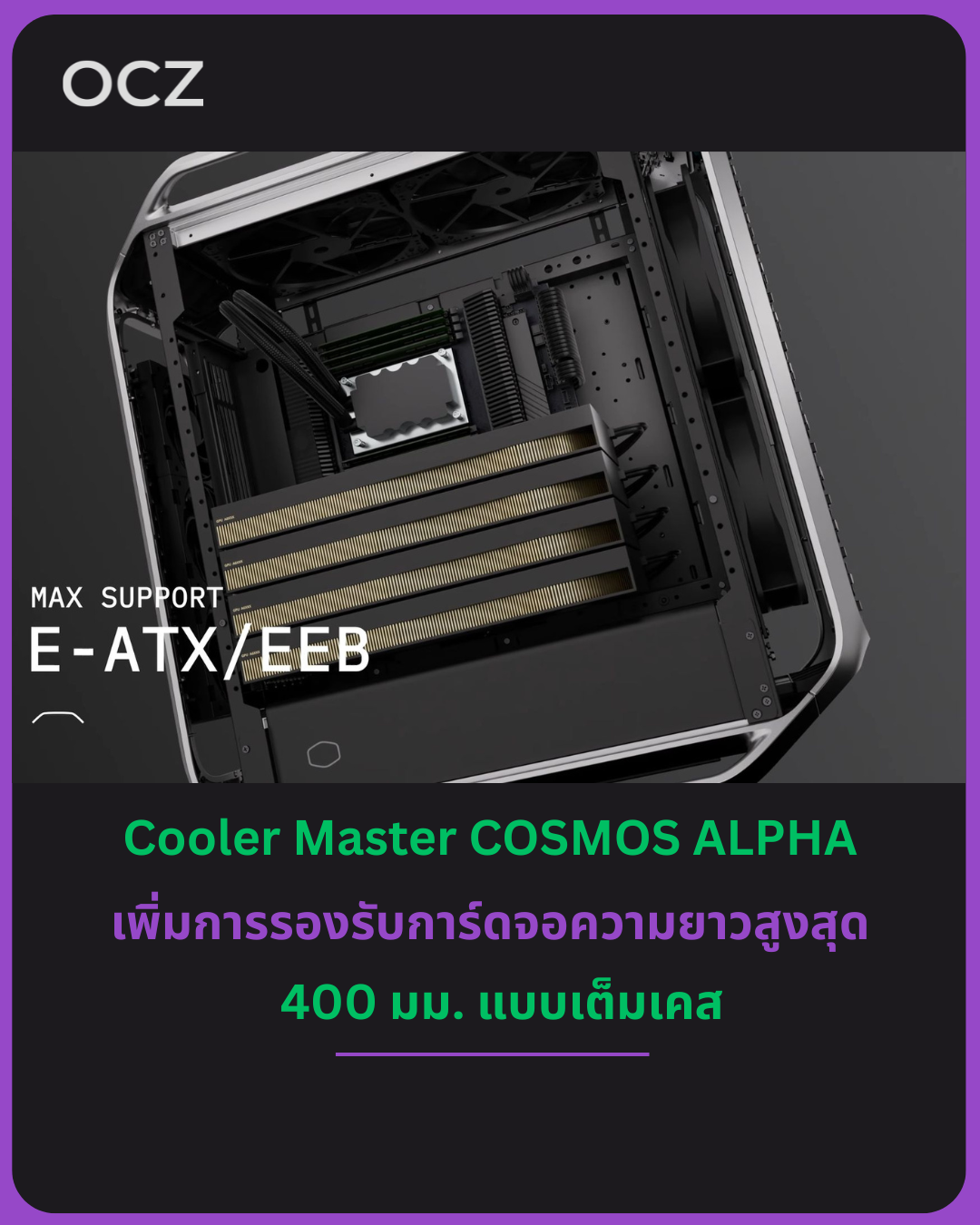 Cooler Master กำลังเตรียมเปิดตัวเคสซีรีส์เรือธงรุ่นใหม่ COSMOS ALPHA ซึ่งหนึ่งในจุดเด่นสำคัญคือการออกแบบมาเพื่อรองรับการ์ดจอขนาดใหญ่ของยุคปัจจุบัน ตัวเคสแบบ Full-Tower รุ่นนี้ติดตั้ง ขาตั้งรองรับ GPU (GPU Support Bracket) ที่ยาวพาดเต็มความกว้างของเคส รองรับการ์ดจอได้ยาวสูงสุดถึง 400 มม.