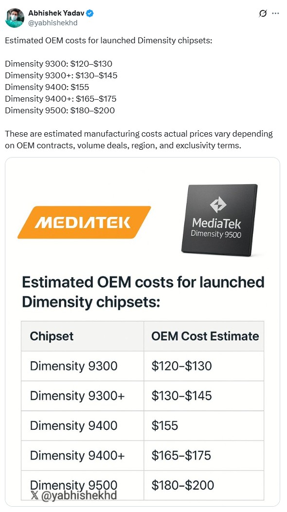 ผู้ใช้งาน X (Twitter) ชื่อ Abhishek Yadav ได้เปิดเผยข้อมูลราคาของ Dimensity 9500 ต่อจากที่เขาเคยเผยตัวเลขของ Snapdragon 8 Elite Gen 5 มาก่อน
