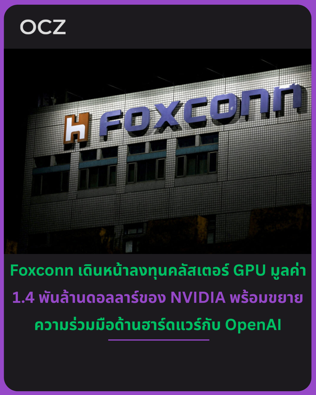 ในงาน Foxconn Tech Day ประจำปีที่ไทเป Foxconn ประกาศว่า ศูนย์ซูเปอร์คอมพิวติ้งมูลค่า 1.4 พันล้านดอลลาร์ ที่บริษัทสร้างร่วมกับ NVIDIA จะพร้อมใช้งานในช่วงครึ่งปีแรกของปี 2026 ศูนย์แห่งนี้จะกลายเป็น คลัสเตอร์ GPU ขั้นสูงที่ใหญ่ที่สุดในไต้หวัน ใช้ฮาร์ดแวร์ NVIDIA Blackwell GB300 และจะถูกดูแลโดยหน่วยธุรกิจ AI และคลาวด์ใหม่ของ Foxconn ในชื่อ Visonbay.ai