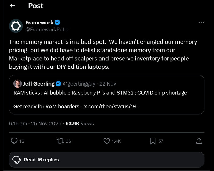 “ตลาดหน่วยความจำกำลังอยู่ในจุดแย่ เราไม่ได้ปรับขึ้นราคาหน่วยความจำเอง แต่เราจำเป็นต้องถอด RAM แบบขายแยกออกจาก Marketplace เพื่อกันพวกกักตุนสินค้า (scalpers) และเก็บสต๊อกไว้สำหรับลูกค้าที่ซื้อร่วมกับแล็ปท็อป DIY Edition ของเรา”