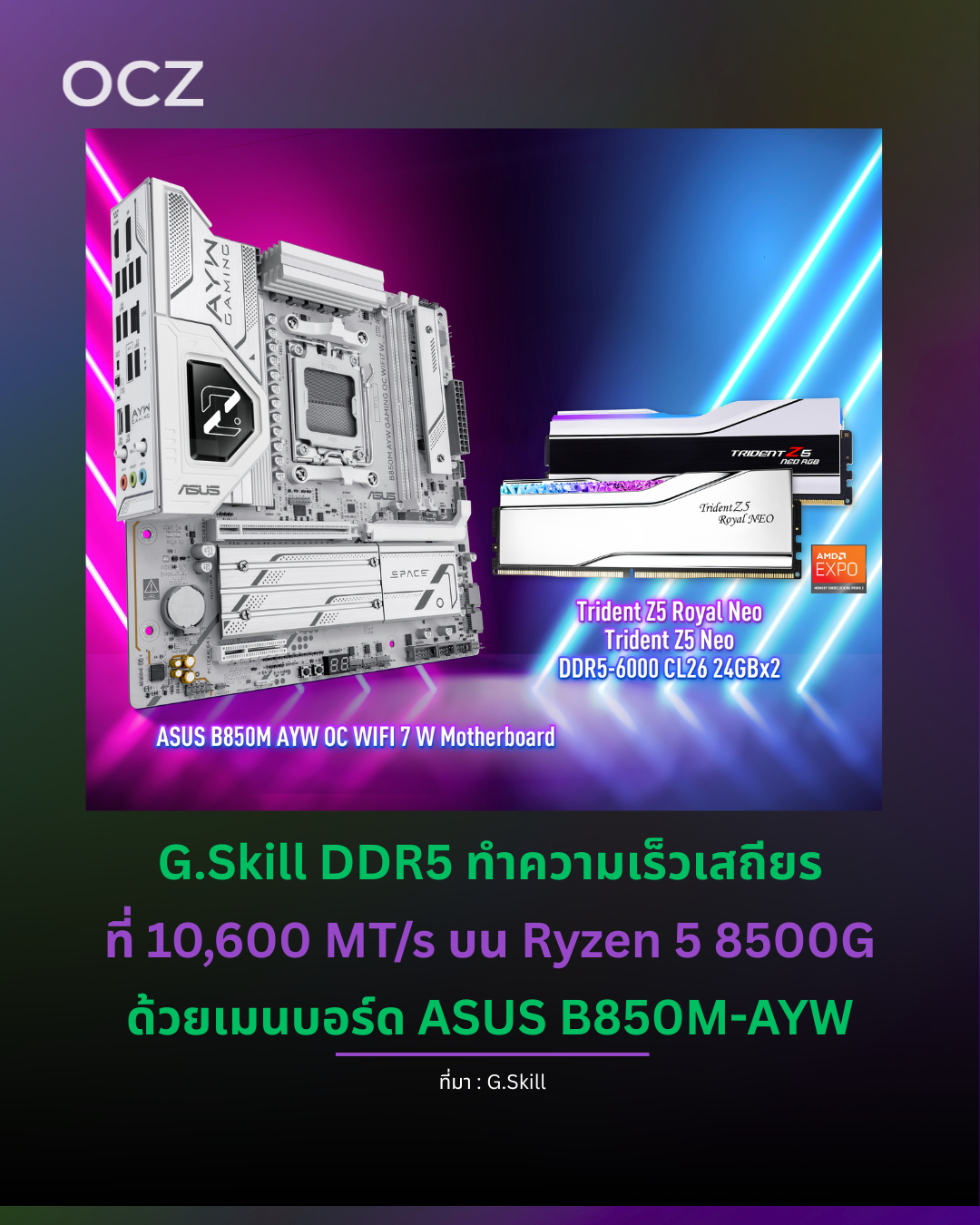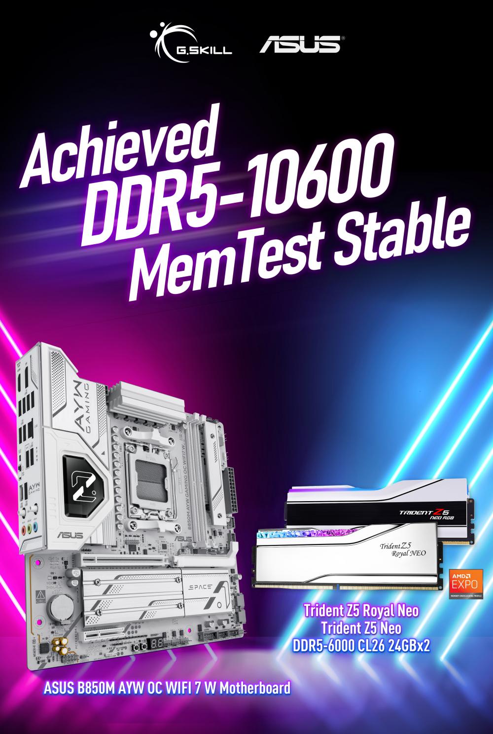 ล่าสุด G.Skill ได้ประกาศว่าสามารถทำความเร็ว DDR5 ที่ 10,600 MT/s ได้อย่างเสถียรในสภาพแวดล้อมที่ “ใกล้เคียงการใช้งานจริง” มากกว่า โดยใช้เมนบอร์ด ASUS B850M-AYW ซึ่งเป็นเมนบอร์ดระดับกลางที่ออกแบบมาสำหรับการโอเวอร์คล็อก (ยังไม่วางจำหน่ายอย่างแพร่หลาย) คู่กับ Ryzen 5 8500G APU ที่มาพร้อมคอนโทรลเลอร์หน่วยความจำรุ่นใหม่ซึ่งพัฒนาเหนือกว่า CPU ตระกูล Granite Ridge เดิม ในการทดสอบใช้แรม 2 แถว ขนาด 24 GB รันที่ความเร็ว 10,600 MT/s ด้วยค่า CL50