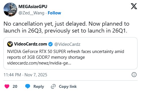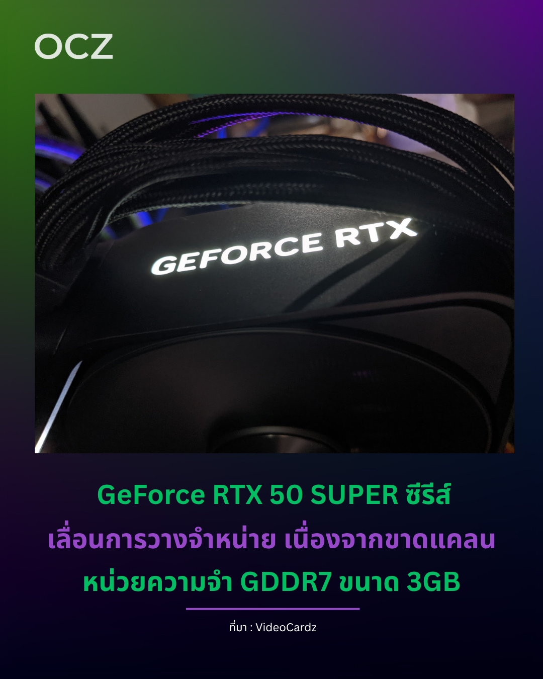 ตามโพสต์ของพวกเขาบน X ระบุว่า โมดูล 3GB GDDR7 ขาดตลาดและจะไม่ถึงมือผู้บริโภคเดสก์ท็อป ส่งผลโดยตรงต่อรุ่นที่ลือกันอย่าง RTX 5080 SUPER, RTX 5070 Ti SUPER และ RTX 5070 SUPER