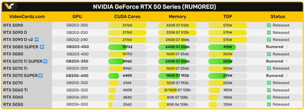 จากรายงานก่อนหน้านี้ แหล่งข่าวระบุว่า RTX 50 SUPER มีแผนเปิดตัวช่วง ปลายไตรมาส 1 ถึงต้นไตรมาส 2 ปี 2026 โดยมุ่งเน้นไปที่ความจุหน่วยความจำที่มากขึ้น โดยแผนเดิมคือขยับจาก 2GB เป็น 3GB GDDR7 ซึ่งจะทำให้ RTX 5080 SUPER และ RTX 5070 Ti SUPER มี 24GB ส่วน RTX 5070 SUPER มี 18GB ทั้งหมดอิงจาก GPU GB203 และ GB205 เหมือนกับซีรีส์ RTX 50 รุ่นปกติ
