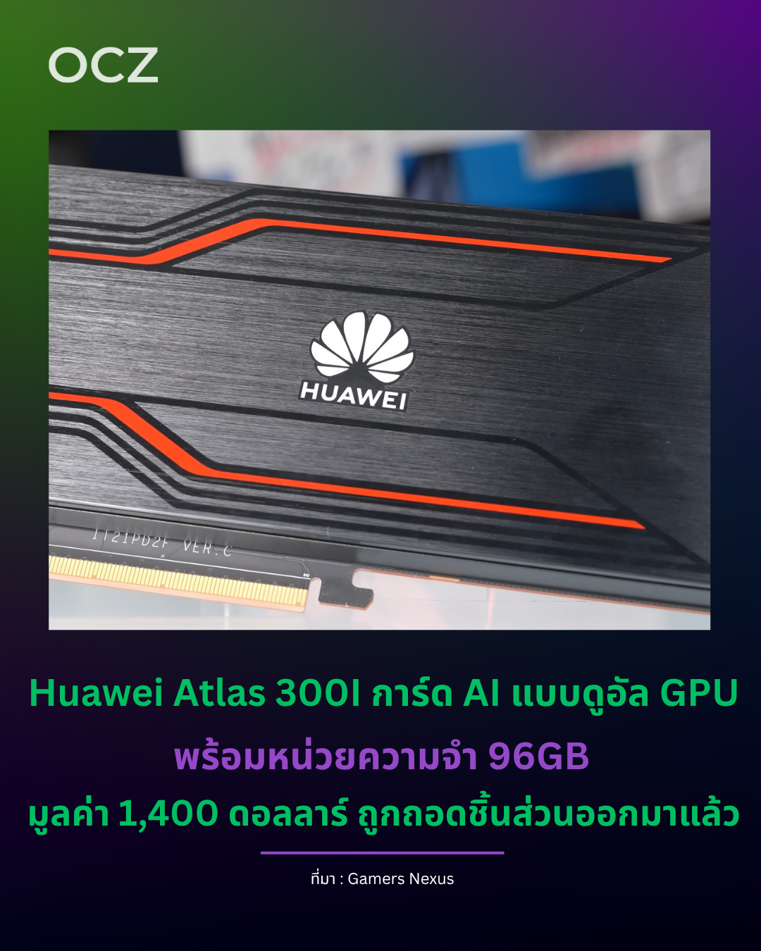 Gamers Nexus ได้ทำการแกะชิ้นส่วน Huawei Atlas 300I Duo ซึ่งเป็นการ์ดเร่งความเร็วแบบสองชิป (Dual-GPU) ที่ติดตั้งหน่วยความจำรวม 96GB LPDDR4X (48GB ต่อชิป) โดยราคาที่พวกเขาได้มานั้นอยู่ที่ประมาณ 1,400 ดอลลาร์สหรัฐรวมค่าส่ง แต่เป็นราคาที่ได้มาผ่าน “ช่องทางไม่เป็นทางการ” เนื่องจากการ์ดรุ่นนี้ ไม่วางจำหน่ายนอกประเทศจีน เช่นเดียวกับที่ NVIDIA ถูกห้ามขายการ์ด RTX 5090 non-D และ RTX PRO 6000 (สถาปัตยกรรม GB202) ให้กับตลาดจีน