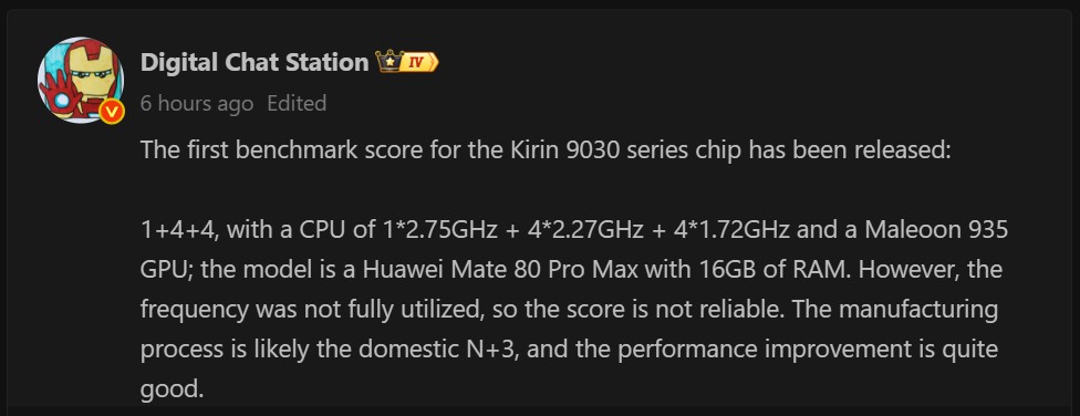 แหล่งข่าวจาก Weibo อย่าง Digital Chat Station ระบุว่า SoC ยังทำงานไม่เต็มประสิทธิภาพ และชิปถูกผลิตบนกระบวนการ SMIC N+3 พร้อมบอกว่าประสิทธิภาพดีขึ้นกว่าเดิม แต่เท่าที่เห็นคะแนนตอนนี้ ผลลัพธ์ยังคง “น่าผิดหวังมาก”