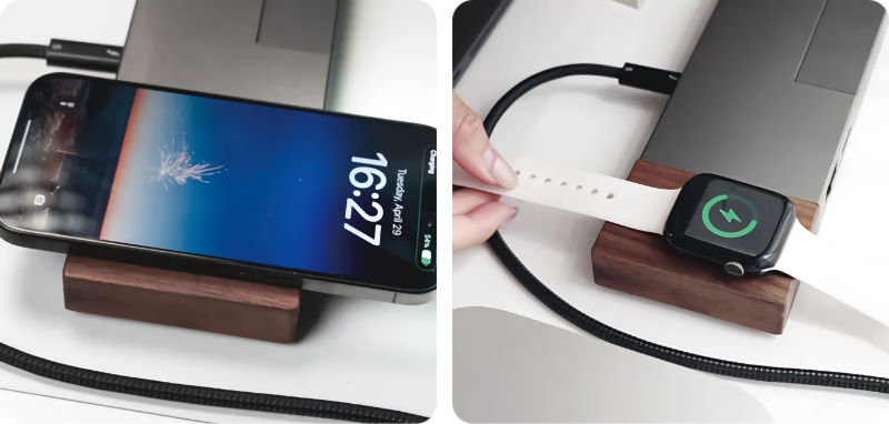 ตัวเครื่องผลิตจาก อะลูมิเนียม CNC ทั้งชิ้น, ส่วน แท่นชาร์จไร้สาย สามารถเลือกแบบ ไม้ธรรมชาติ ได้ และยังมี ระบบระบายความร้อนแบบแอคทีฟ ภายในเพื่อรักษาประสิทธิภาพการทำงานอย่างต่อเนื่อง.