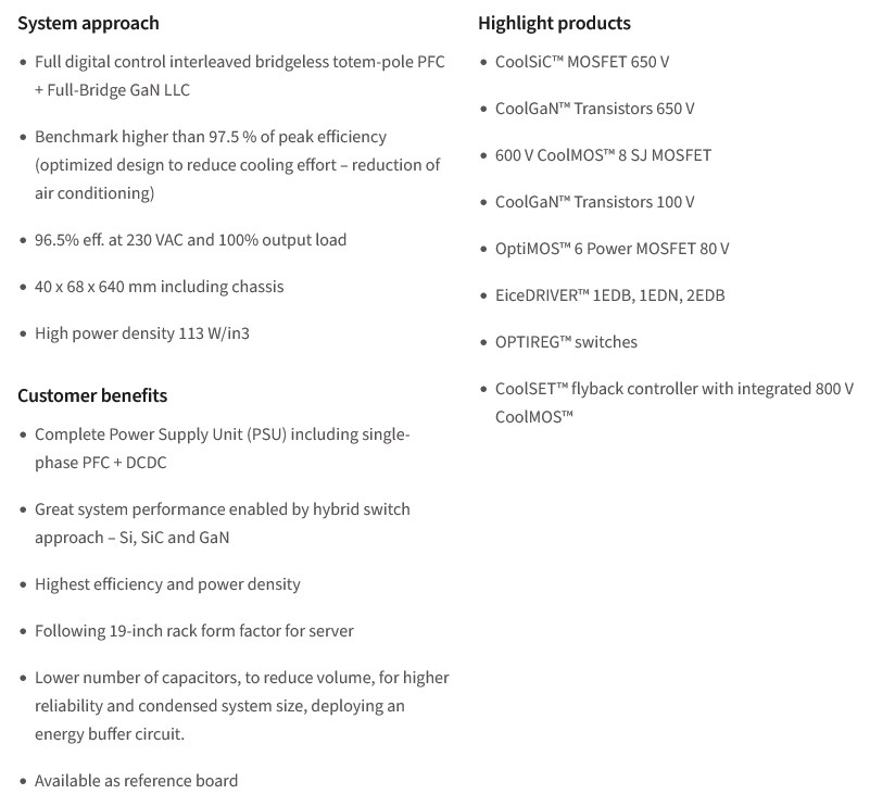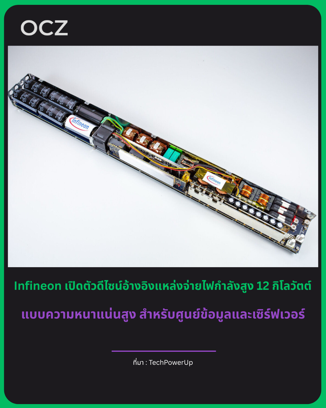 Infineon Technologies AG เปิดตัวดีไซน์อ้างอิง (Reference Design) แหล่งจ่ายไฟกำลังสูง 12 กิโลวัตต์ สำหรับ Power Supply Unit (PSU) ที่ออกแบบมาโดยเฉพาะเพื่อศูนย์ข้อมูลด้าน AI และงานเซิร์ฟเวอร์ โดยดีไซน์นี้มาพร้อมกับประสิทธิภาพสูง ความหนาแน่นกำลังสูง และใช้ประโยชน์จากวัสดุเซมิคอนดักเตอร์หลักทั้งหมด ได้แก่ ซิลิคอน (Si), ซิลิคอนคาร์ไบด์ (SiC) และแกลเลียมไนไตรด์ (GaN) ซึ่งเหมาะสำหรับวิศวกรวิจัยและพัฒนา นักออกแบบฮาร์ดแวร์ และผู้พัฒนาระบบอิเล็กทรอนิกส์กำลัง