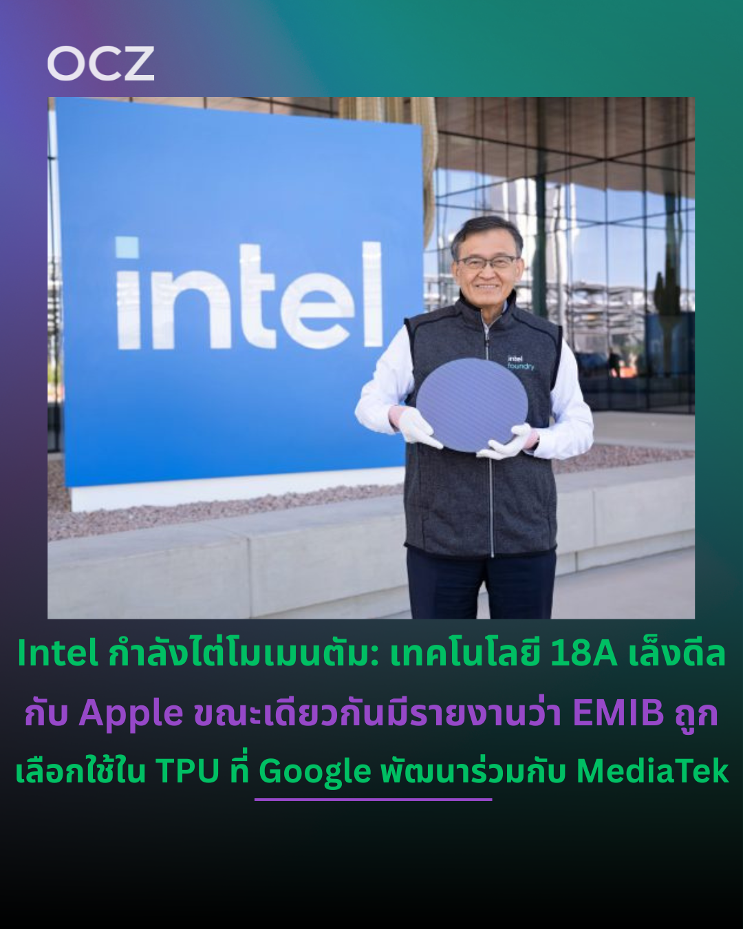 เพิ่มว่า MediaTek ก็เริ่มใช้แพ็กเกจ EMIB-T ของ Intel เพื่อเพิ่มกำลังการผลิต โดยเฉพาะท่ามกลางความต้องการ TPU ของ Google ที่เพิ่มขึ้น และความแออัดของกำลังผลิต CoWoS ของ TSMC อุตสาหกรรมระบุว่า MediaTek เริ่มรับสมัครวิศวกร EMIB แล้ว และมีแผนจะนำได 2nm / 3nm จาก TSMC ไปแพ็กเกจด้วย EMIB-T ของ Intel ซึ่งรองรับไดใหญ่ระดับ 120×180 มม.