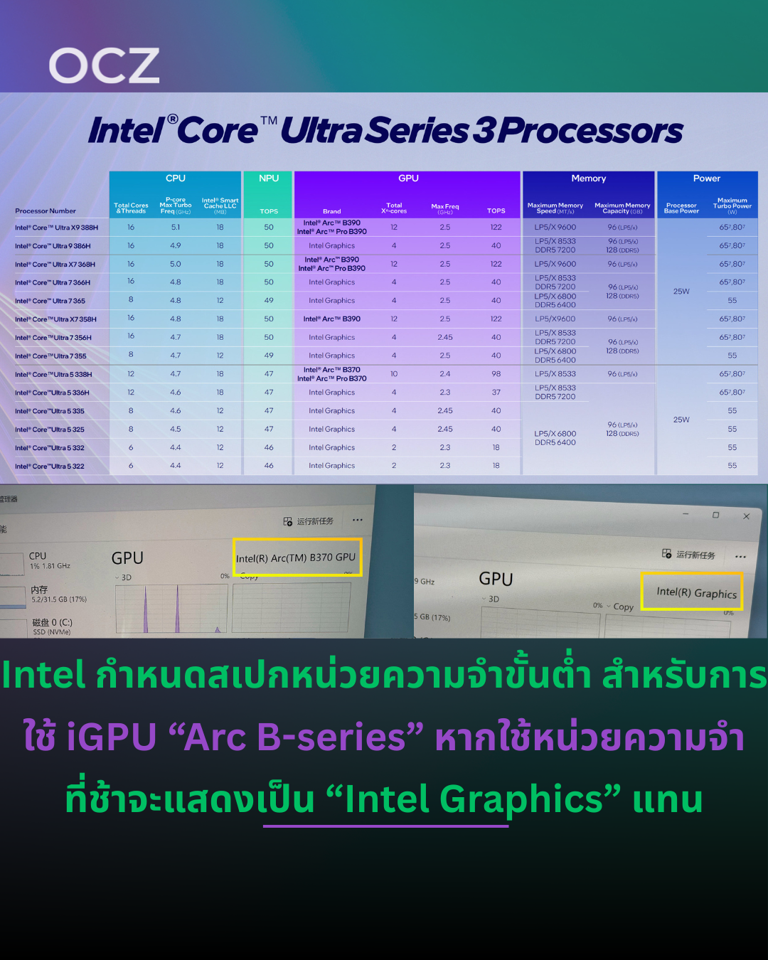 Core Ultra X7 และ X9: ใช้ iGPU Arc B390/B370 รองรับหน่วยความจำสูงสุด LPDDR5X-9600