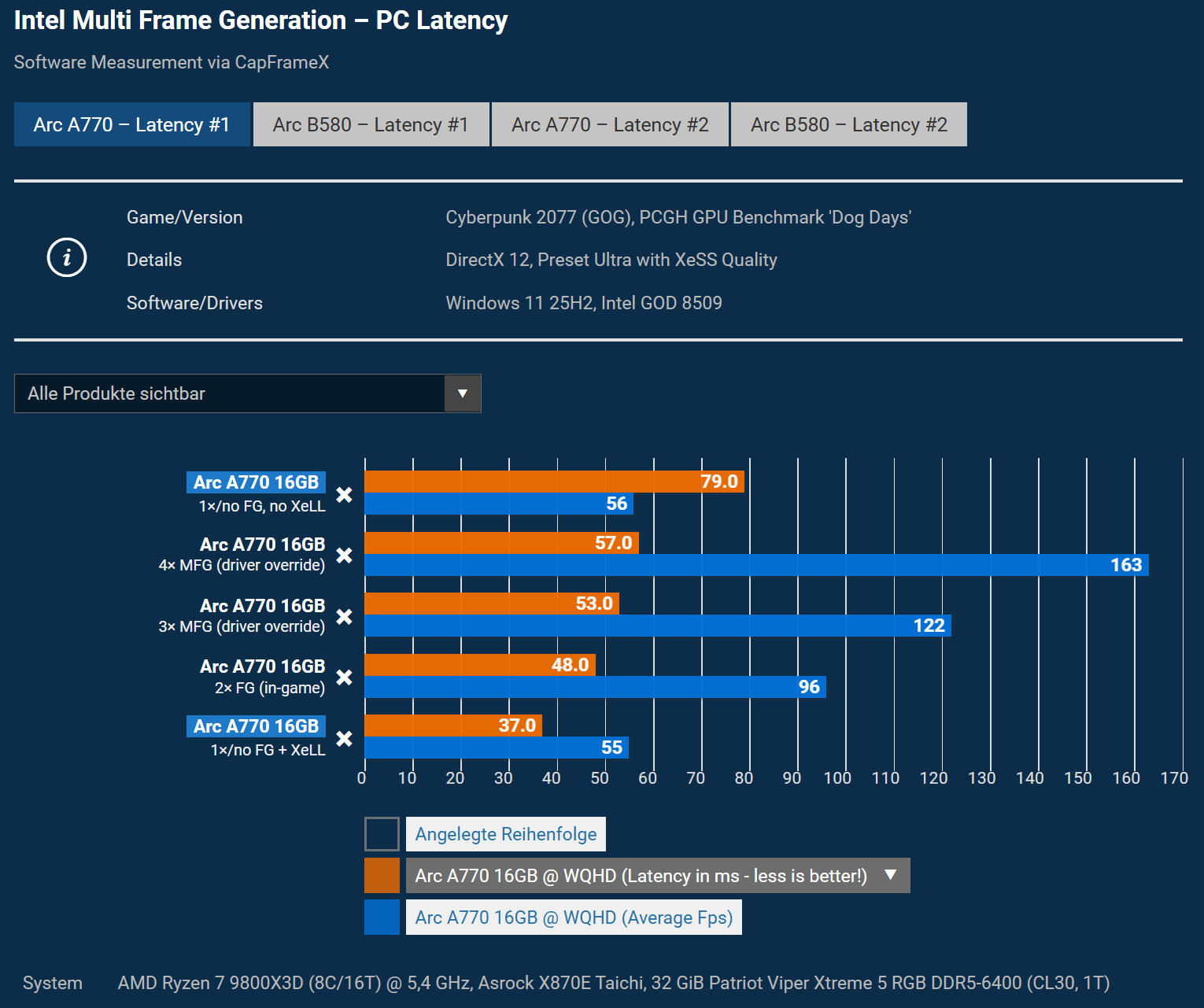 สื่อ PC Games Hardware ได้ทดสอบฟีเจอร์นี้กับ Arc A770 16GB และ Arc B580 12GB ในเกมทั้งหมด 7 เกม ที่ความละเอียด 2560 × 1440 พร้อมตั้งค่า XeSS ระดับ Quality