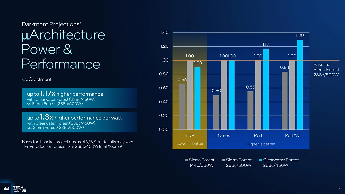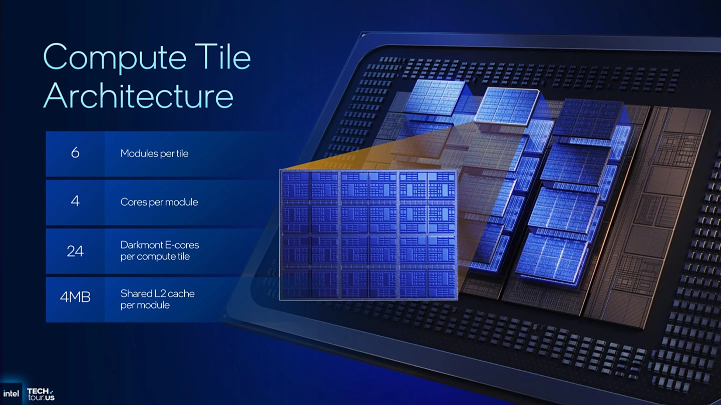 แต่ละโมดูลประมวลผลของ “Clearwater Forest” จะมี 6 คลัสเตอร์แบบ 4 คอร์ รวมเป็น 24 คอร์สถาปัตยกรรม “Darkmont” ซึ่งเมื่อเทียบกับ “Crestmont” บน “Sierra Forest” ได้รับการปรับปรุงทั้งในด้าน Branch Prediction, ความกว้างในการถอดรหัสคำสั่ง, ขนาด Execution Engine และอื่น ๆ ส่งผลให้รุ่นเรือธงสามารถเพิ่มประสิทธิภาพได้สูงสุด 17% และเพิ่มประสิทธิภาพด้านพลังงานได้ถึง 30%