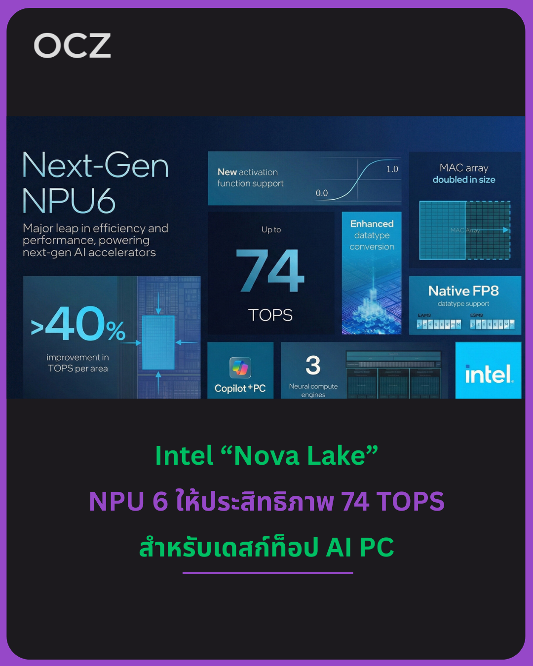 โปรเซสเซอร์เดสก์ท็อป Intel “Nova Lake” รุ่นถัดไปจะมาพร้อมกับ NPU (Neural Processing Unit) รุ่นที่ 6 และตอนนี้เรามีข้อมูลประสิทธิภาพเบื้องต้นจากนักปล่อยข่าวหลุดชื่อดัง @jaykihn0 บน X โดยข้อมูลล่าสุดระบุว่า Nova Lake-S เวอร์ชันเดสก์ท็อปจะมี NPU บนหนึ่งในไทล์ที่ให้ประสิทธิภาพสูงถึง 74 TOPS (INT8) ซึ่งถือว่าสูงกว่าทุกสิ่งที่ Intel เคยปล่อยในกลุ่มเดสก์ท็อปมาก่อน