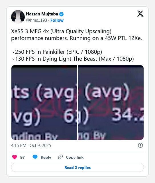 โดยทั้งหมดใช้ XeSS 3 MFG 4× (Ultra Quality Upscaling) บนระบบที่ใช้พลังงานเพียง 45 วัตต์ (PTL 12Xe)