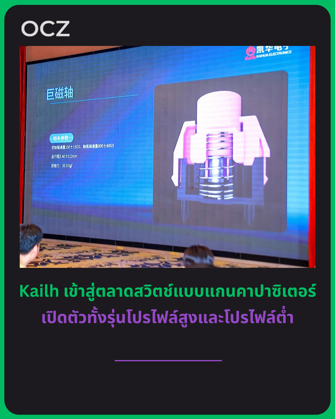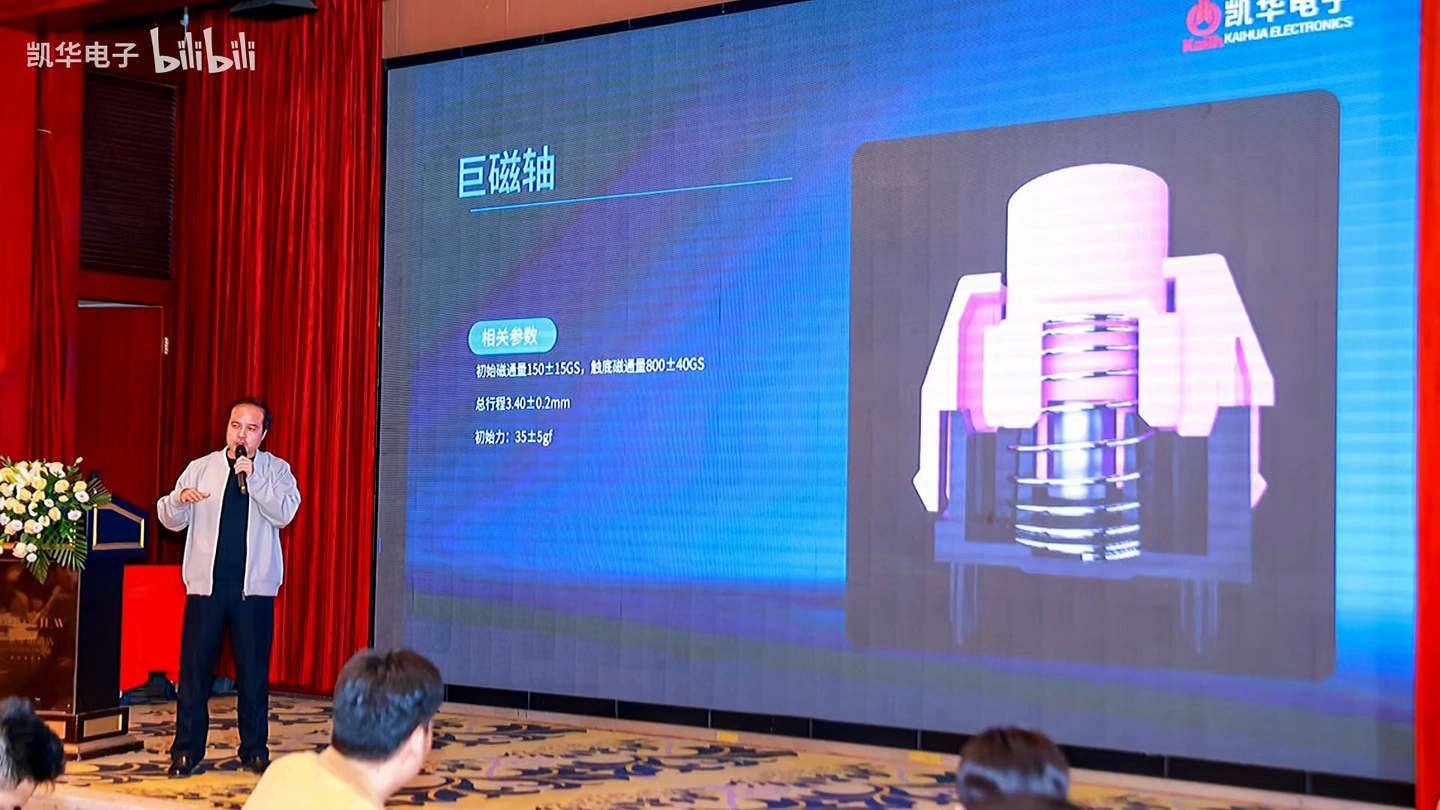 ในงานเดียวกัน Kailh ยังเผยโฉมสวิตช์แม่เหล็กรุ่นใหม่ “Giant Magnetic Shaft” ที่ให้ค่าฟลักซ์แม่เหล็กเมื่อกดสุดสูงถึง 800±40GS อีกด้วย