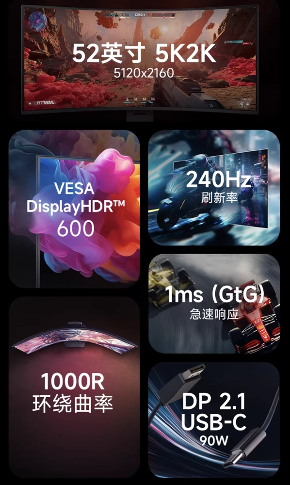 จอรุ่นนี้ใช้ พาเนล VA ความละเอียด 5120 × 2160 รองรับรีเฟรชเรตสูงสุด 240Hz มาพร้อมความโค้ง 1000R และมีค่า GtG response time 1ms รองรับความสว่างแบบ HDR สูงสุด 600 nits รวมถึงรองรับ สี 10-bit และครอบคลุมขอบเขตสี 95% DCI-P3