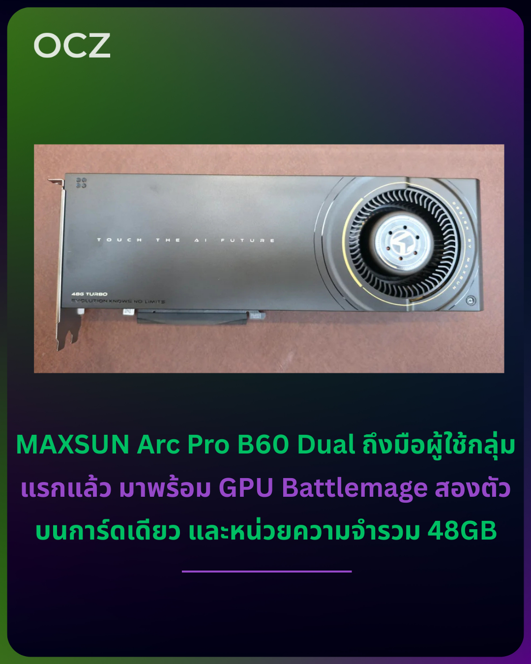 ลูกค้าในสหราชอาณาจักรรายแรกเริ่มได้รับการ์ด MAXSUN Arc Pro B60 Dual 48G Turbo แล้ว ซึ่งเป็นการ์ดจอระดับโปรแบบ Dual-GPU ที่ใช้สถาปัตยกรรม Intel Battlemage โดยมีผู้ใช้รายหนึ่งโพสต์ภาพการได้รับของจริงและความประทับใจแรกบน Reddit