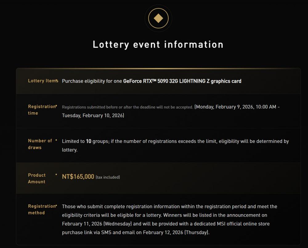 MSI เปิดเผยราคานี้ผ่านกิจกรรมแจกของรางวัลแบบ 24 ชั่วโมง ซึ่งจะเริ่มในวันจันทร์ที่ 9 กุมภาพันธ์ เวลา 10:00 น. (เวลาไต้หวัน) และสิ้นสุดในวันอังคารที่ 10 กุมภาพันธ์ รายชื่อสินค้ายังยืนยันว่า RTX 5090 Lightning Z ที่นำไปโชว์ในงาน CES 2026 ไม่ได้เป็นแค่ดีไซน์ระดับพรีเมียมเท่านั้น แต่ยังเป็นสินค้าที่มีราคาพรีเมียมอย่างแท้จริง โดยมีจำนวนจำกัดเพียง 1,300 ตัว เท่านั้น
