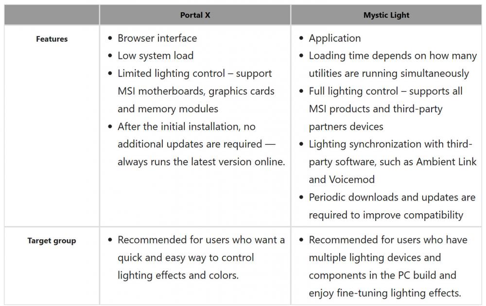 ล่าสุด MSI แนะนำว่า สำหรับผู้ใช้ที่ต้องการควบคุมไฟอย่างรวดเร็วและง่ายดาย ควรลองใช้ Portal X ผ่านเว็บเบราว์เซอร์ เพราะสามารถจัดการไฟของเมนบอร์ด MSI ที่ใช้ชิปเซ็ต Intel และ AMD 800 Series, การ์ดจอ MSI GeForce RTX 50 Series, รวมถึงหน่วยความจำ (RAM) จากหลายยี่ห้อ ซึ่ง MSI ระบุว่า Portal X เข้ากันได้กับแบรนด์หน่วยความจำส่วนใหญ่ในตลาด