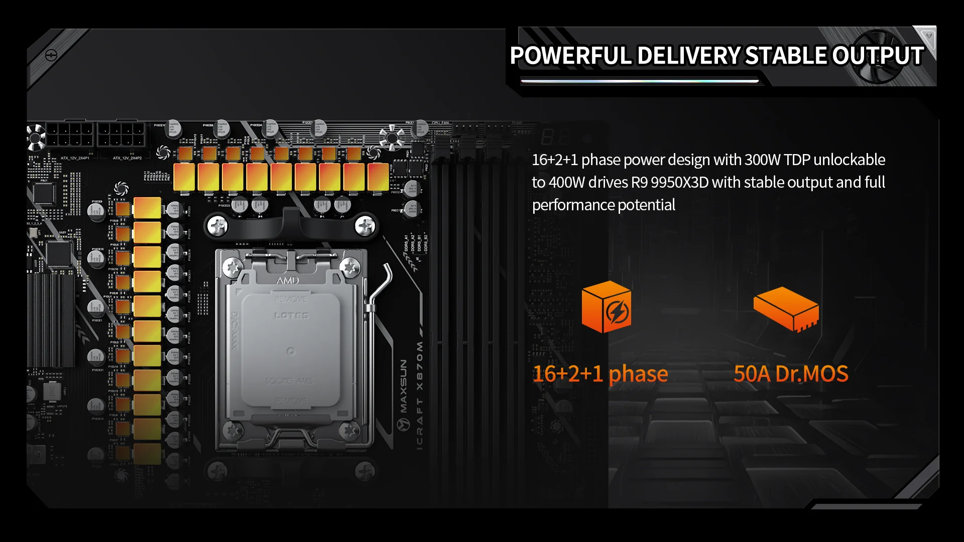 iCraft X870M มาพร้อมภาคจ่ายไฟ 16+2+1 (50A) ที่รองรับซีพียูตัวแรงอย่าง Ryzen 9 9950X3D ได้อย่างไร้กังวล Maxsun ระบุว่าเมนบอร์ดรองรับ TDP สูงสุด 300W และยัง ปลดล็อกให้รองรับได้ถึง 400W เพื่อประสิทธิภาพระดับสูงสุดในการโอเวอร์คล็อก