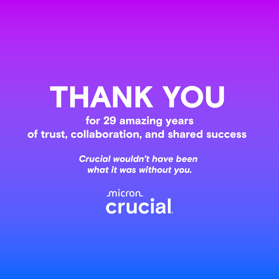 “ขอบคุณสำหรับ 29 ปีที่ยอดเยี่ยม เต็มไปด้วยความเชื่อใจ ความร่วมมือ และความสำเร็จร่วมกัน Crucial คงไม่เป็นเช่นวันนี้หากไม่มีพวกคุณ”