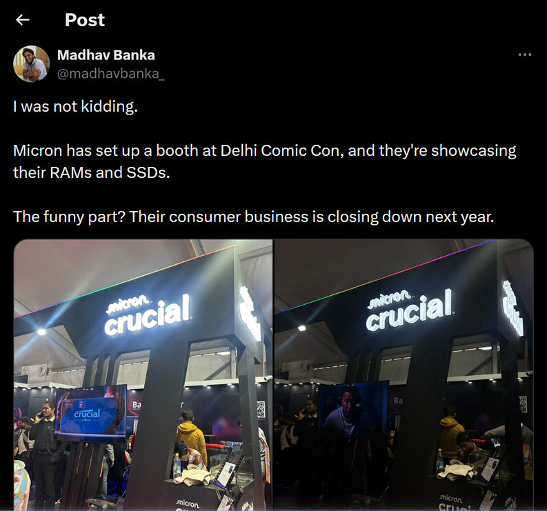 “เชื่อหรือไม่ แต่ Crucial India ตั้งบูธในงาน Delhi Comic Con วันนี้! ผมลืมถ่ายรูป แต่ตลกมาก”
