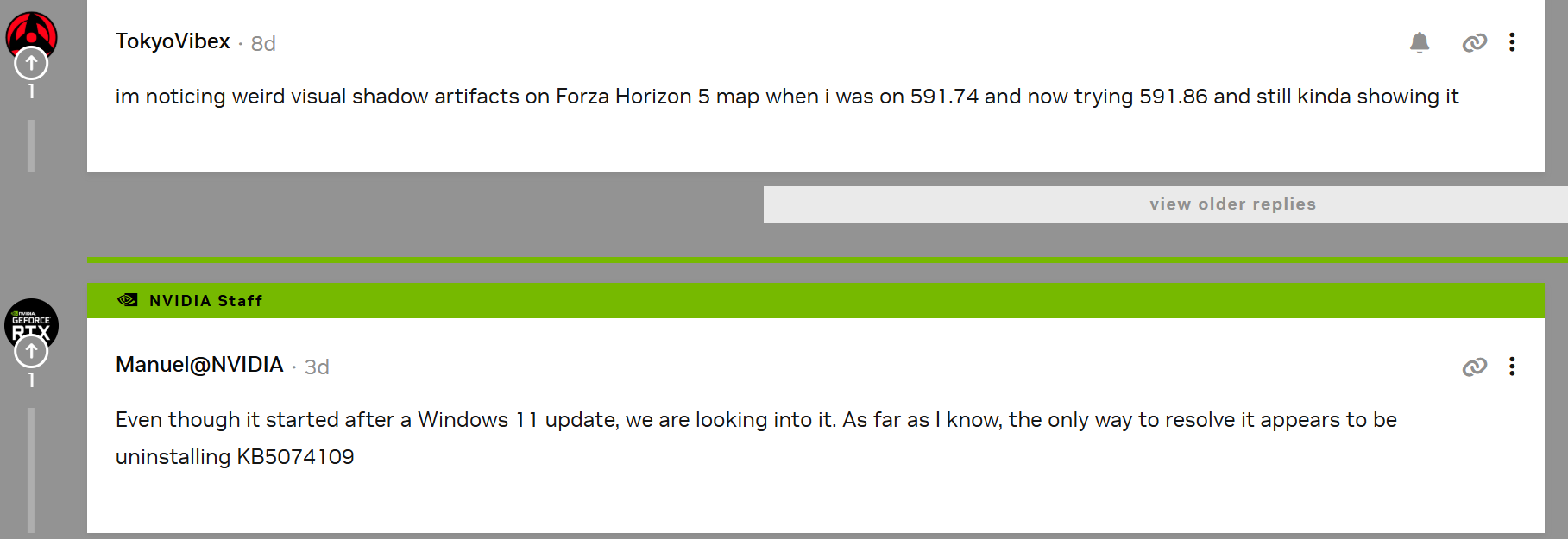 ในฟอรัม Nvidia.com มีผู้ใช้งานหลายรายตั้งกระทู้ร้องเรียนเกี่ยวกับปัญหาหลากหลายรูปแบบ ไม่ว่าจะเป็นหน้าจอดำหรือภาพแตก หลังจากติดตั้ง Windows Update ล่าสุด โดยในช่วงแรกหลายคนคิดว่าเป็นปัญหาจากไดรเวอร์ NVIDIA ที่ปล่อยออกมาในเดือนมกราคม 2026 เช่นกัน แต่ภายหลังพบว่าสาเหตุหลักคือแพตช์ Windows เดือนมกราคม (KB5074109)