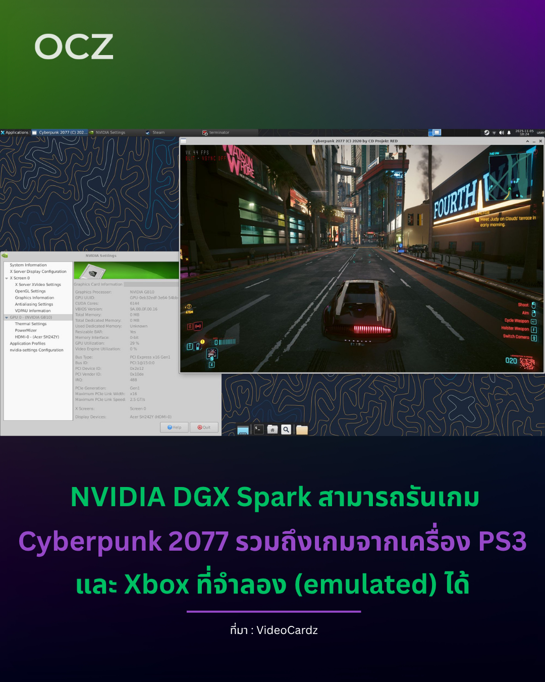 ล่าสุดมีโพสต์บน Reddit แสดงให้เห็นว่า Cyberpunk 2077 สามารถรันบน DGX Spark ได้ผ่าน Box64 ซึ่งเป็นเลเยอร์แปลคำสั่งจาก x86 ไปยัง ARM