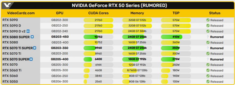 รายงานชี้ว่า การรีเฟรชครั้งนี้จะเน้นไปที่ การเพิ่มความจุหน่วยความจำ โดย RTX 5080 SUPER และ RTX 5070 Ti SUPER คาดว่าจะมาพร้อม VRAM GDDR7 ขนาด 24GB ขณะที่ RTX 5070 SUPER อาจเพิ่มจาก 12GB เป็น 18GB การเปลี่ยนไปใช้โมดูล GDDR7 ขนาด 3GB ต่อชิป แทนแบบ 2GB ยังช่วยให้สามารถขยายความจุได้มากขึ้นในทุกรุ่น พร้อมกันนั้นก็คาดว่าจะมีการเพิ่มจำนวน CUDA Cores ซึ่งอาจทำให้ความต้องการพลังงานสูงขึ้นตามไปด้วย