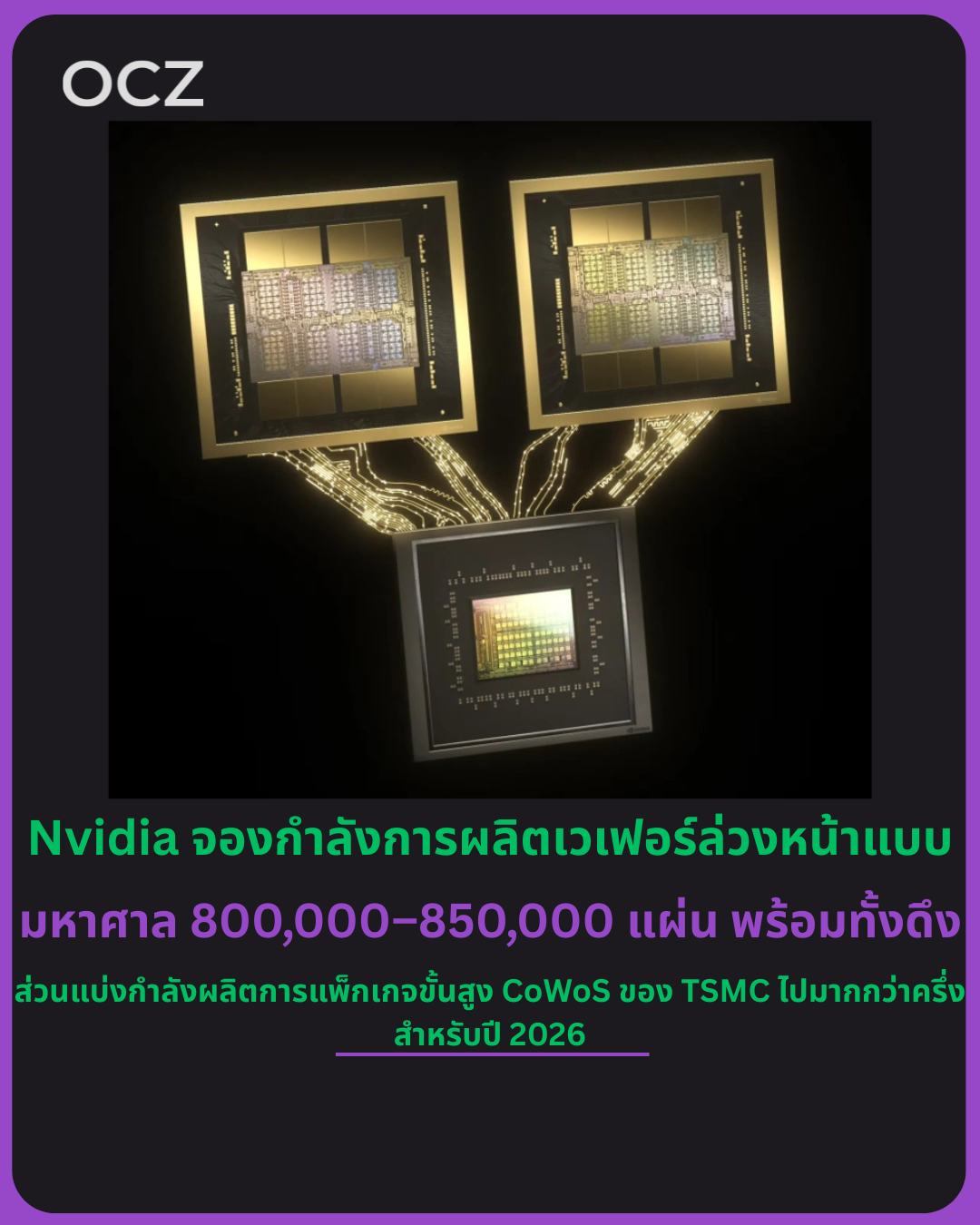 ตามรายงานจากสื่อ ระบุว่า Nvidia จองกำลังผลิตเวเฟอร์ล่วงหน้าสำหรับปี 2026 ประมาณ 800,000–850,000 แผ่น คิดเป็นมากกว่า 50% ของกำลังการผลิต CoWoS ทั้งหมดของ TSMC ในปีนั้น ขณะที่คู่แข่งรายสำคัญอย่าง Broadcom และ AMD กลับได้รับส่วนแบ่งกำลังผลิตเพียงเล็กน้อยเท่านั้น