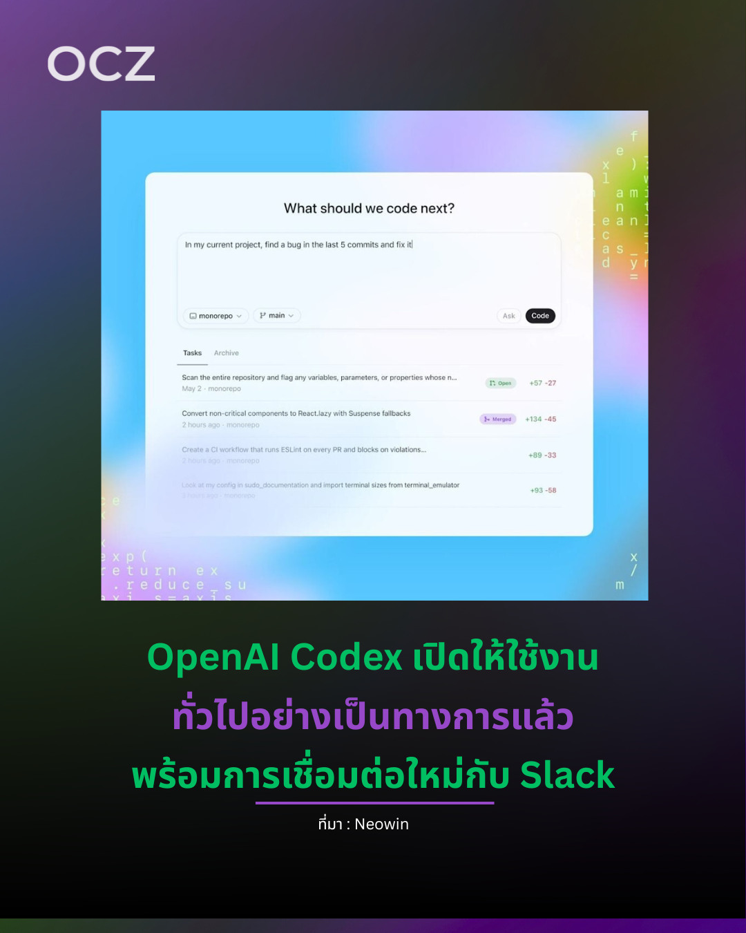 ผู้ใช้สามารถมอบหมายงานให้ Codex ได้โดยตรงจากแชนเนลหรือเธรดแชตใน Slack เพียง แท็ก @Codex แล้วระบบจะเข้าใจบริบทของการสนทนาโดยอัตโนมัติ และดำเนินการตามคำสั่งให้เสร็จบน Codex Cloud ผู้ใช้สามารถเลือกได้ว่าจะรวม (merge) โค้ดที่ AI สร้างขึ้นเข้ากับโปรเจกต์จริงหรือไม่ -