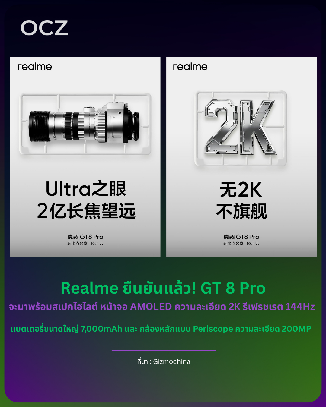 อีกโปสเตอร์ที่ปล่อยออกมา ยืนยันว่า GT 8 Pro จะใช้กล้องเทเลโฟโต้แบบปริทรรศน์ 200MP โดย Aric Song ผู้อำนวยการฝ่ายการตลาดของ Realme เผยว่าจะรองรับการซูม 3x Optical Zoom และ 12x Lossless Zoom