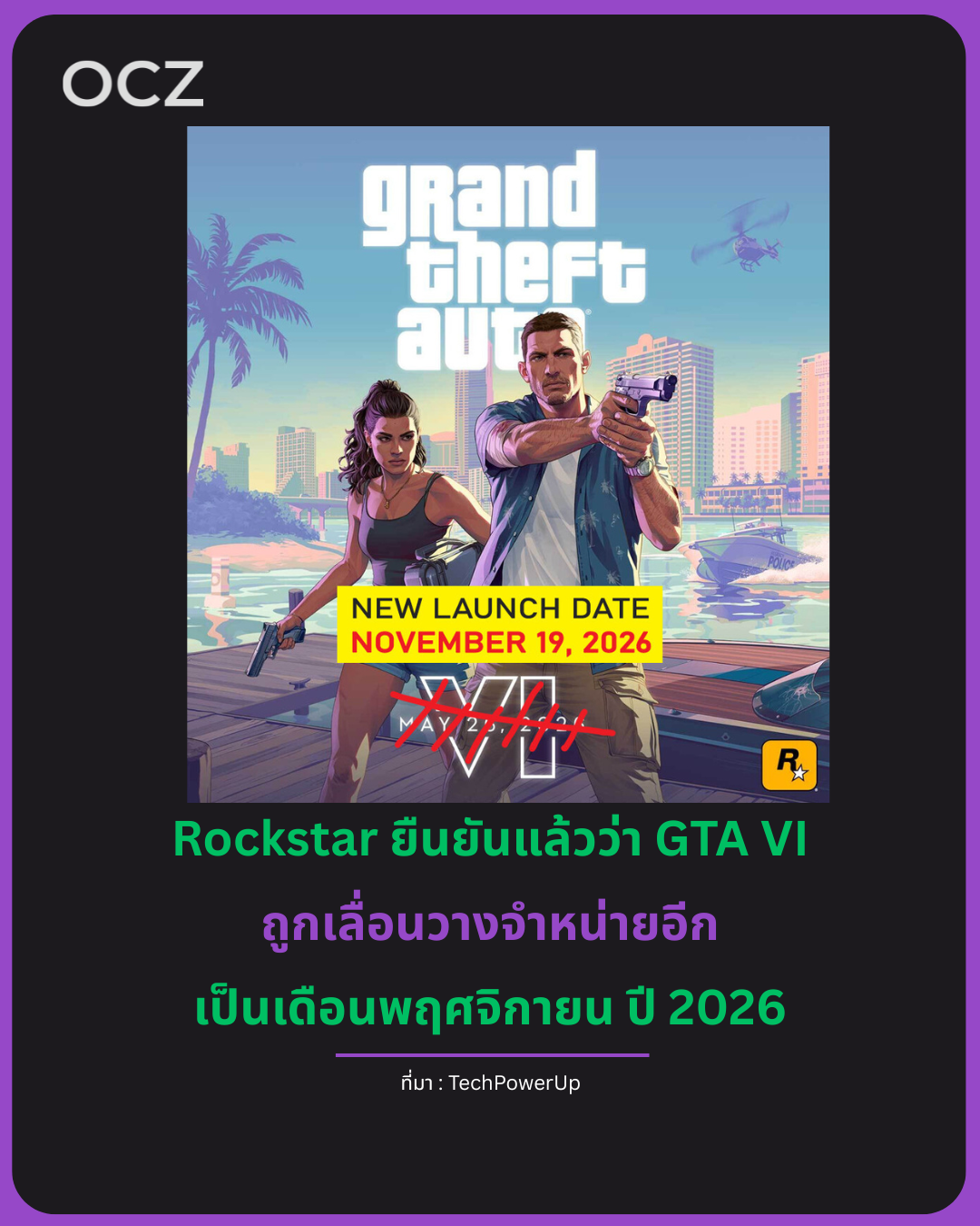 Rockstar Games ประกาศเลื่อนการวางจำหน่าย Grand Theft Auto VI ออกไปอีกครั้ง โดยกำหนดวันใหม่เป็นวันที่ 19 พฤศจิกายน 2026 ตามแถลงการณ์ที่เผยแพร่เมื่อวันพฤหัสบดีที่ผ่านมา