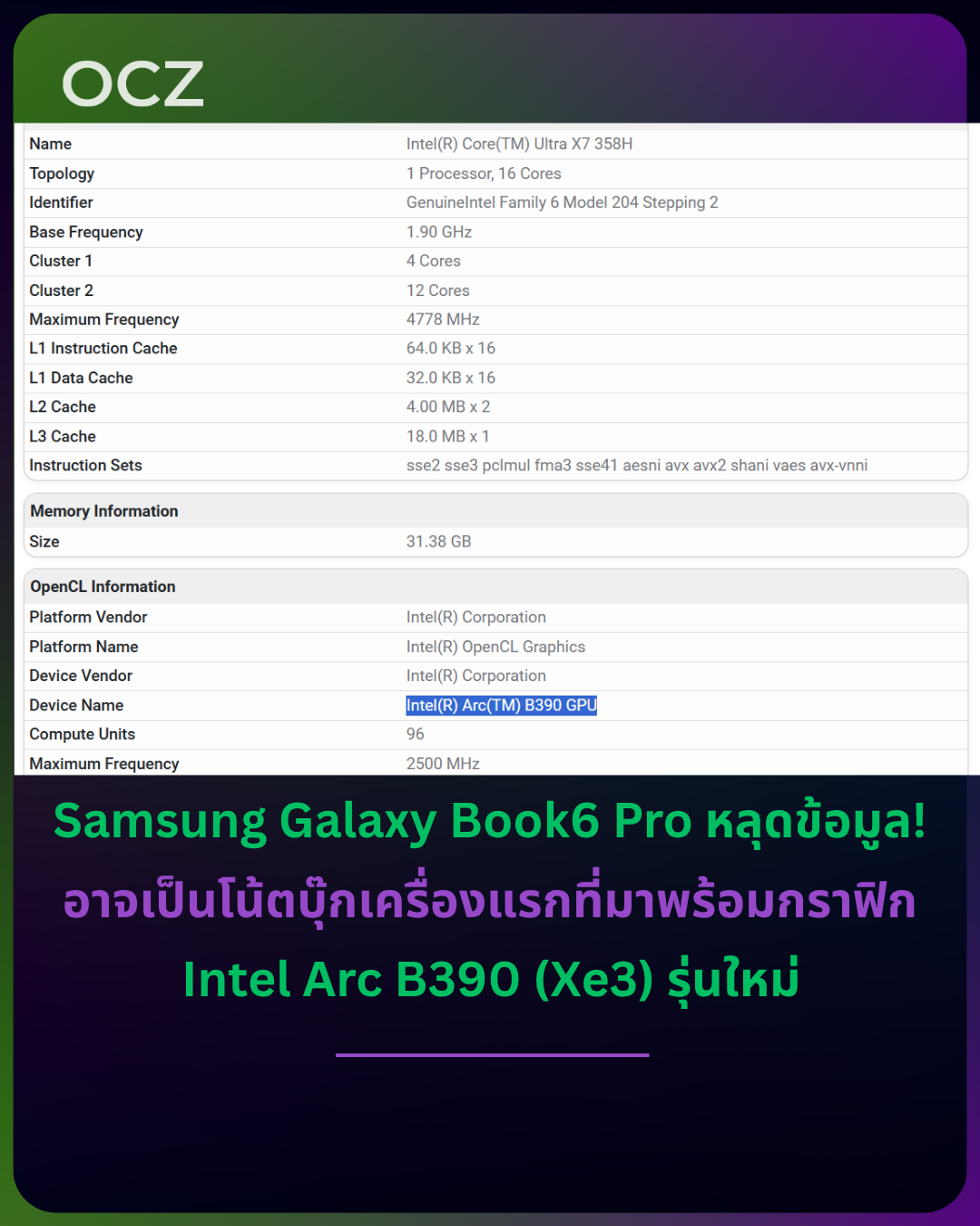 ข้อมูลการหลุดครั้งนี้มาจากโน้ตบุ๊ก Samsung Galaxy Book6 Pro ซึ่งเป็นรุ่นเรือธงรุ่นถัดไปของ Samsung ที่ใช้ซีพียู Intel Core Ultra X7 358H — แต่ยังไม่ใช่รุ่นสูงสุด เพราะสัญญาณนาฬิกาจะต่ำกว่า X7 388H อยู่ราว 300MHz (5.1GHz → 4.78GHz)