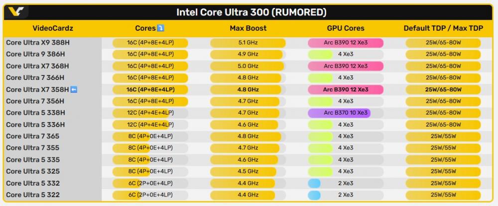 โดยสรุปคือ ซีรีส์ Intel Core Ultra X-Series จะมาพร้อมกราฟิก Arc B390 ที่ใช้คอร์ Xe3 จำนวน 12 คอร์ ส่วนรุ่นรองลงมาจะมี Arc B370 (10 Xe3 คอร์) และรุ่นเล็กกว่าอีกสองรุ่น (4 และ 2 Xe3 คอร์) ซึ่งยังไม่มีชื่อทางการ (คาดว่าอาจใช้ชื่อ B350 / B310)