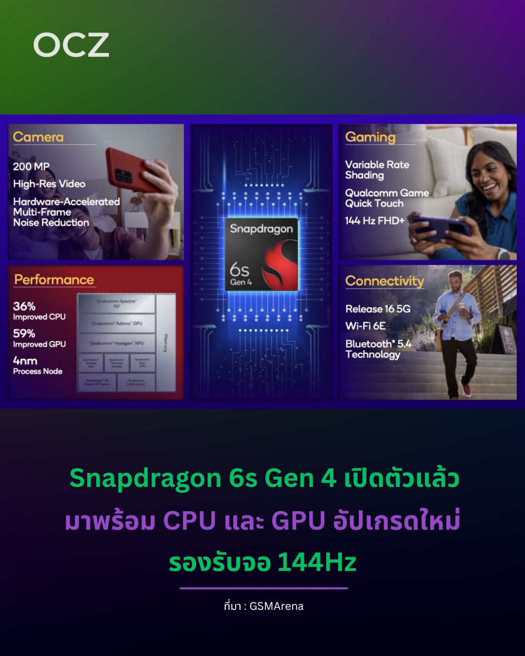 Qualcomm เปิดตัวชิปเซ็ตระดับกลางรุ่นใหม่ Snapdragon 6s Gen 4 มาพร้อมอัปเกรดหลายด้านจาก 6s Gen 3 ทั้งประสิทธิภาพ CPU/GPU ที่ดีขึ้น รวมถึงการรองรับหน้าจอ FHD+ 144Hz, การเชื่อมต่อ 5G ทั้ง mmWave และ sub-6GHz รวมถึง Wi-Fi 6E