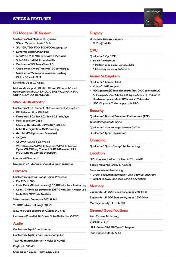 Snapdragon 6s Gen 4 (SM6435-AA) ผลิตบนสถาปัตยกรรม 4nm ของ Samsung โดยเคลมว่าประสิทธิภาพดีขึ้น 36% สำหรับ CPU และ เร็วขึ้น 59% สำหรับ GPU โดยใช้ Kryo CPU แบบ 4 คอร์ประสิทธิภาพสูง (สูงสุด 2.4GHz) และ 4 คอร์ประหยัดพลังงาน (1.8GHz)