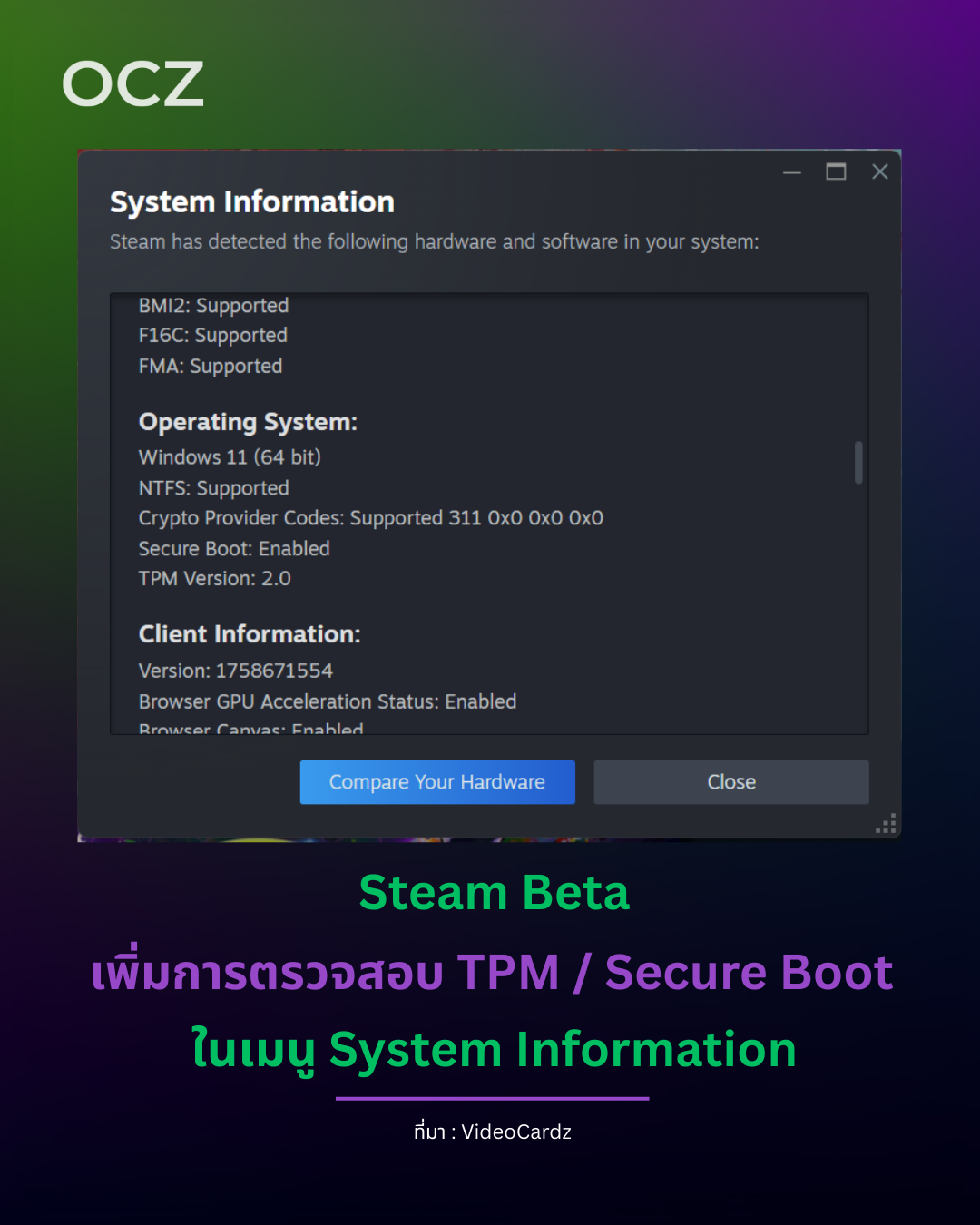 Valve ได้อัปเดต Steam Client Beta เพิ่มฟีเจอร์ใหม่ที่สามารถแสดงสถานะว่า Secure Boot และ TPM เปิดใช้งานอยู่ในเครื่องพีซีของผู้ใช้หรือไม่ โดยจะแสดงข้อมูลในเมนู Help > System Information และยังถูกรวมไว้ใน Steam Hardware Survey ด้วย