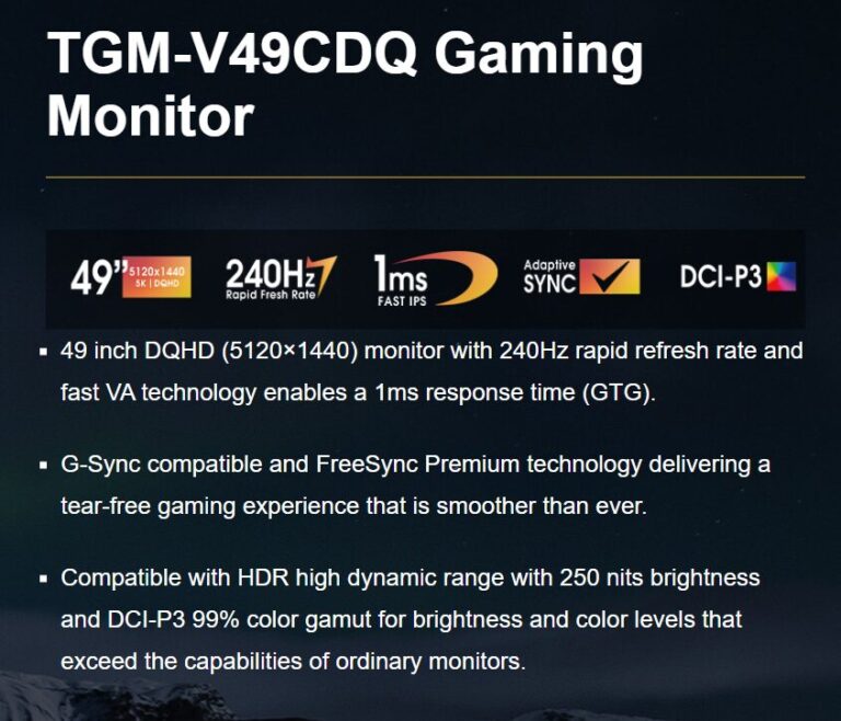 รุ่นใหม่ที่เพิ่มเข้ามามีชื่อว่า TGM-V49CDQ ซึ่งเป็นตัวเลือกพาเนล VA ในกลุ่มจอ 49 นิ้วแบบ Super Ultrawide เดียวกัน